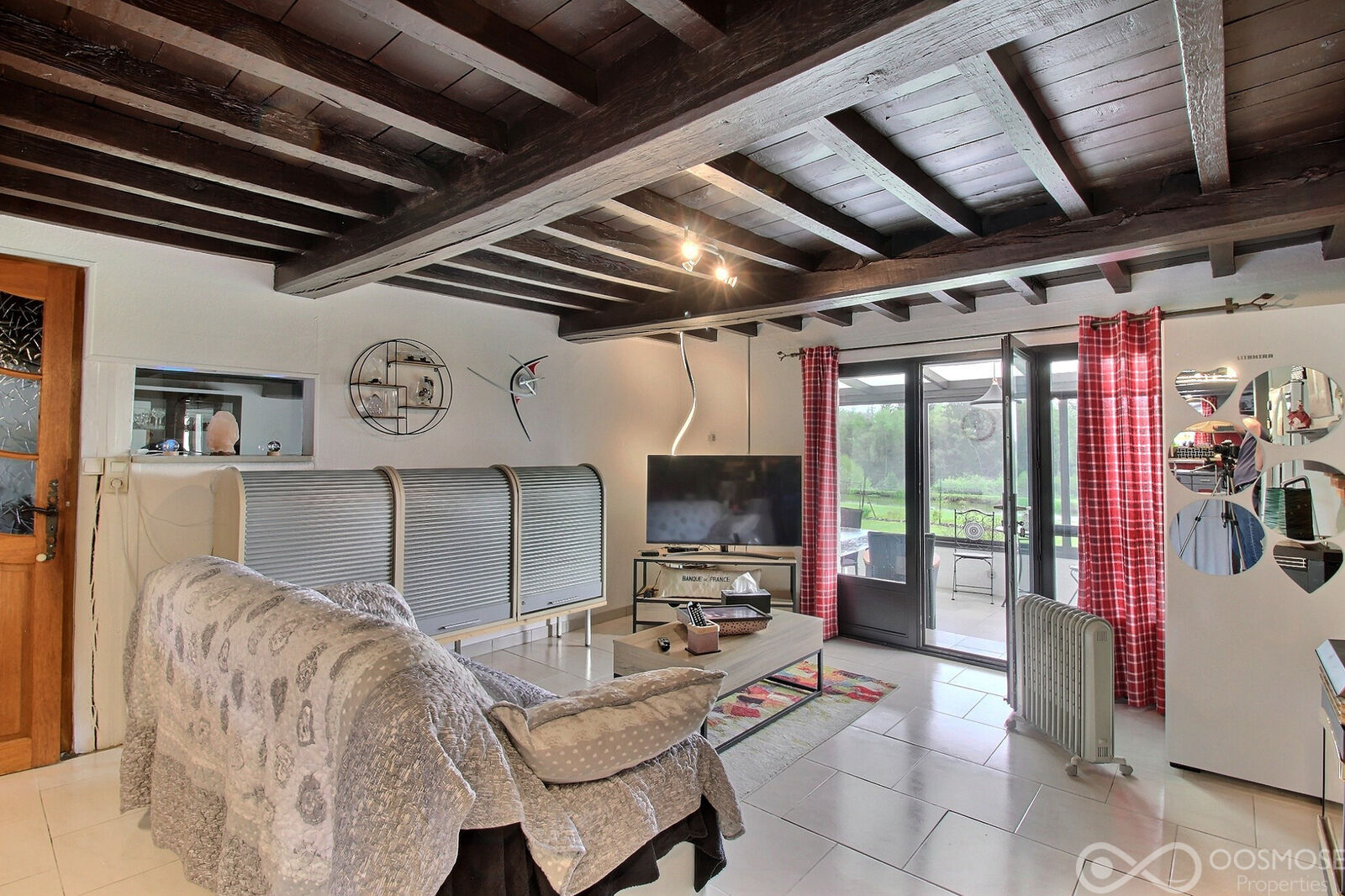 Un hall d'entrée, un grand séjour salon-salle à manger, une cuisine équipée avec coin repas, un espace salon, une grande véranda, une chambre ou bureau, un espace buanderie avec évier et douche, un wc séparé, un cellier, une remise et un garage