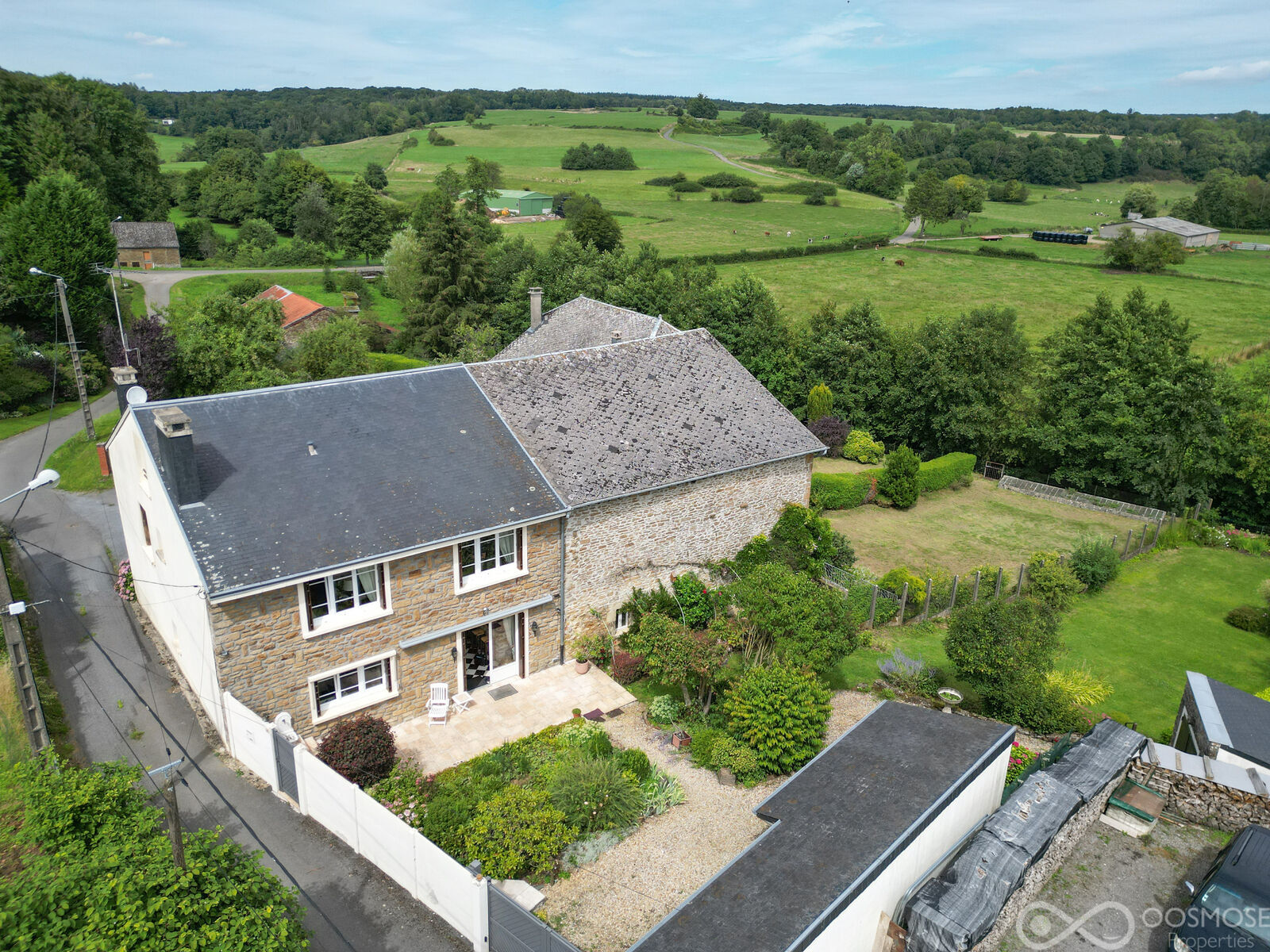 Une charmante propriété en pierre sur 13a 05ca bordé par un ruisseau au bout du terrain; l'ensemble situé à 5' de l'autoroute, 14' de la frontière belge, à 23' de Couvin, 23' de Charleville-Mézières et 23' du Lacs des Vieilles Forges.